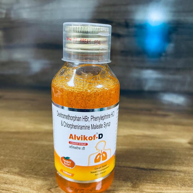 ALVIKOF-D With Dextromethorphan (cough suppressant), Phenylephrine (decongestant), and Chlorpheniramine Maleate (CPM, antihistamine) are multi-symptom formulas for colds, flu, and allergies, treating dry cough, runny nose, sneezing, and stuffiness.